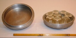 Particularité physique : La yaourtière (bain marie) est composée d'un récipient avec son couvercle en aluminium et de 8 pots en verre. Elle porte l'inscription "YALACTA Breveté SGDG" sur la poignée du couvercle et "YALACTA PIREX" sur les pots en verre. H : 54 cm ; diamètre : 19,5 cm. Verre : H : 6 cm ; diamètre : 6,5 cm. Poids total : 2,4 kg