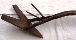 Sert à couper les feuilles de betteraves fourragères, avant la récolte des racines. Avantage : le coupeur se tient debout (moindre fatigue). Rôle des deux tiges pointues parallèles aux montants de la base du manche?