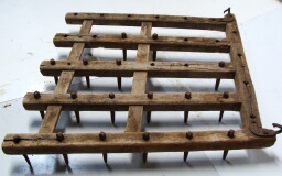 Particularité physique : Montants 5 x en bois. 34 dents en fer (dont plusieurs manquantes). largeur de travail: 130cm, L: 150cm. hauteur dents: 12cm