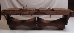 Particularité physique : Double rouleau permettant de rouler deux billons à la fois. Chaque élément, creusé en son milieu est cerclé de fer sur les diamètres extérieurs. Chassis avec plateforme, mais bancards manquants. l travail : 175, l plateforme : 85, diam 37cm.
