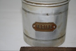Particularité physique : Lot de 4 boîtes en aluminium repoussé: "Farine" "Sucre" "Thé" "Epices" il en manque une, couvercle du service à thé trop grand.