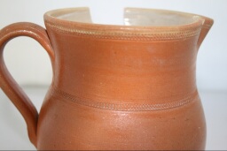 Particularité physique : Pot/pichet en grès vernissé, "2 1/2" sous le pot / fin liseraie décoratif / partie haute ébréchée