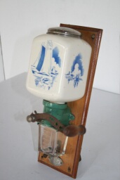 Particularité physique : Moulin à café mural avec godet en verre et trémie en faïence avec support bois, inscriptions: "Peugeot Frères, Modèle Déposé, Valentigney (Doubs)" sur la plaque. Graduation sur le réservoir en verre : "I, II, III, IV, V" Décor de bateaux sur la faïence